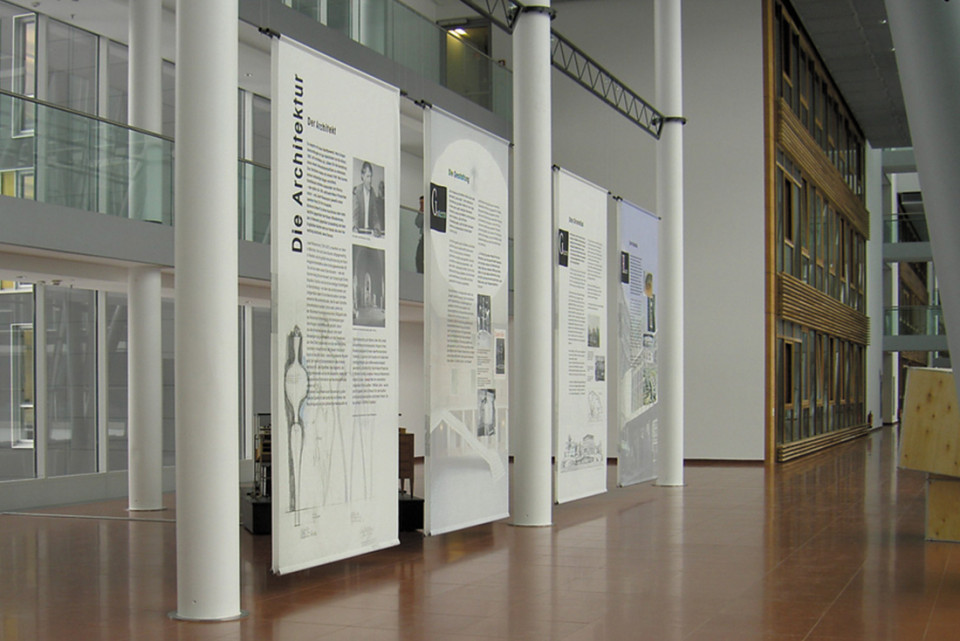 Arbeitswelten Gestern – Heute. 50 Jahre Allianz Hauptverwaltung in München. In der neuen Hauptverwaltung der Allianz AG in Unterföhring wirkte die Ausstellung durch großzügige Grafikflächen: Eine Gazebox gab einen Einblick in die gastronomischen Verhältnisse vor 50 Jahren. Die Inszenierung mit Allianzgeschirr, -besteck und -tischwäsche illustrierte die Bindung der Mitarbeiter an die „Allianzfamilie“.